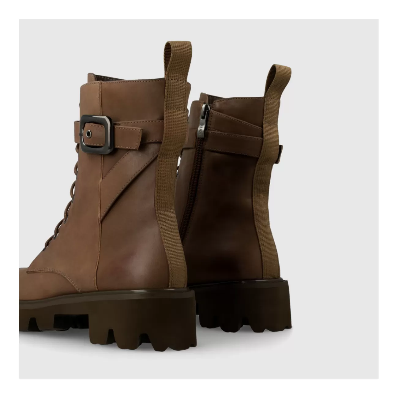 Bottines plates pour femme CE5143 de LODI en cuir. Design style biker avec détail de bride réglable. Design avec semelle en caoutchouc de 4,5 cm et plateforme de 2,5 cm de hauteur. Fermeture par lacets sur le devant. Fermeture latérale intérieure par zip. Bout rond. Intérieur doublé en tissu polaire et semelle en cuir. Inclut une nouvelle semelle en gel pour plus de confort à chaque pas.