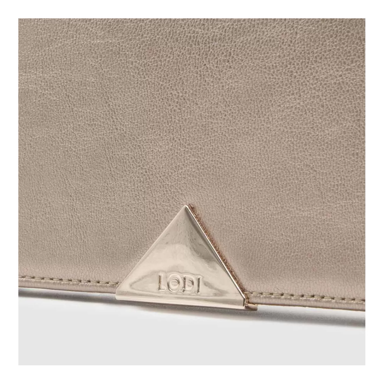 Bolso cartera de mano de LODI en piel de color oro viejo.