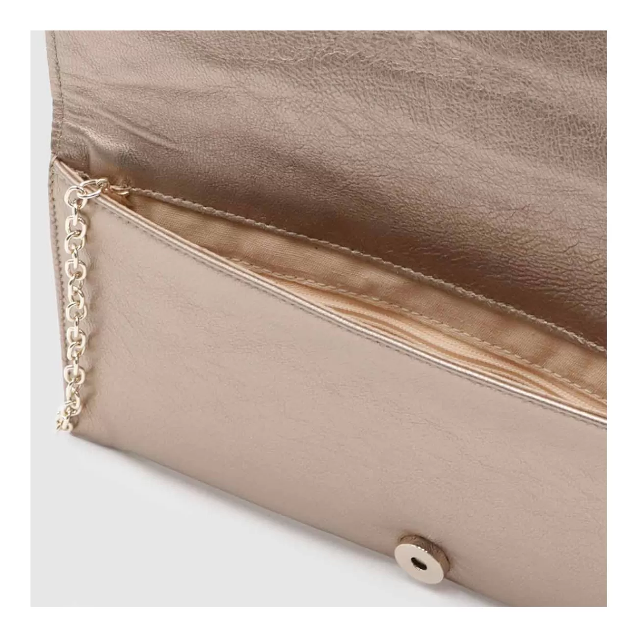 Bolso cartera de mano modelo SIENA de LODI en piel de color oro viejo. Detalle metálico en color oro con el logo de la firma. Asa extraible de hombro en cadena metálica de color oro. Bolsillo interior con cremallera. Interior forrado en tejido. Cierre mediante imán. Alto x Ancho x Fondo 13 x 29 x 2.