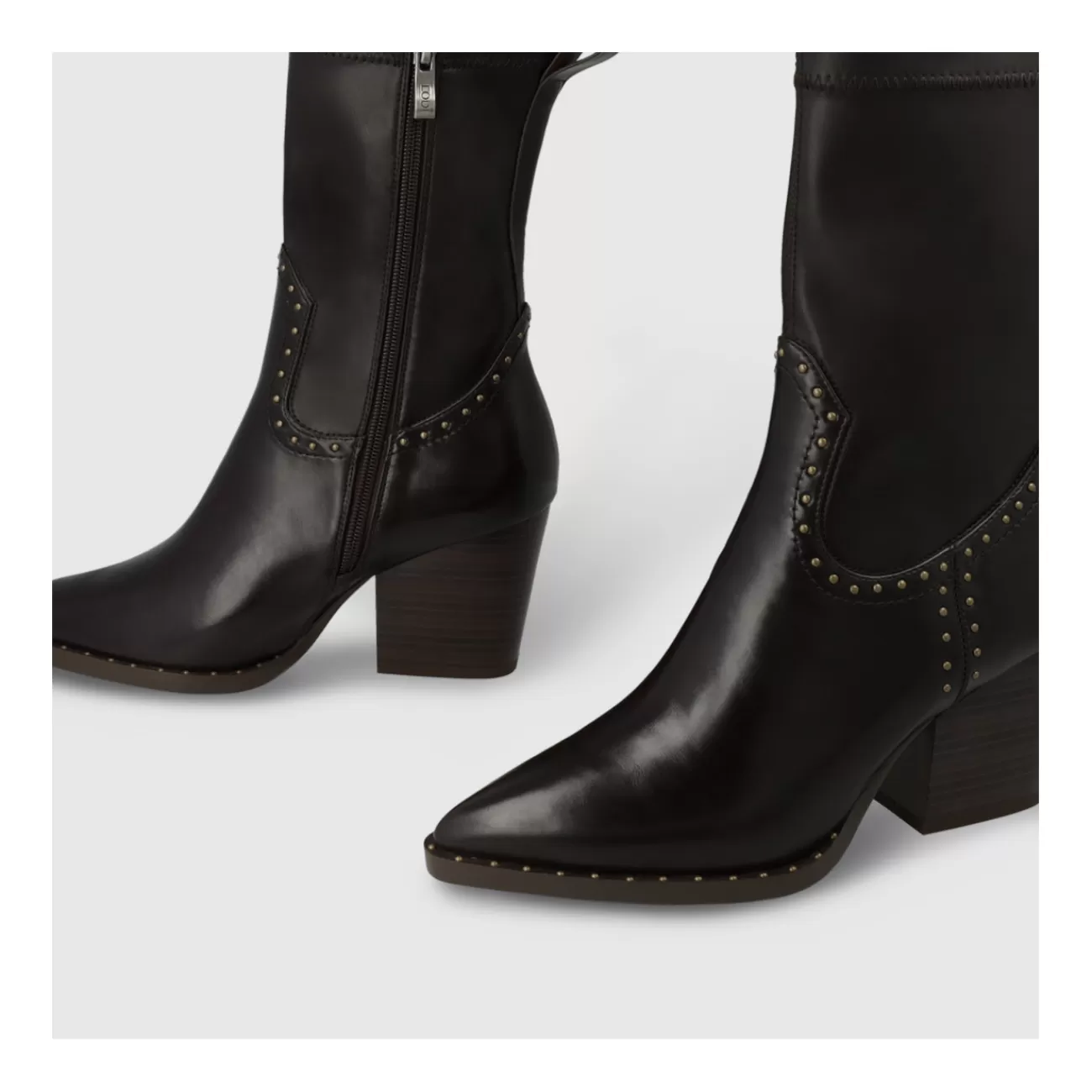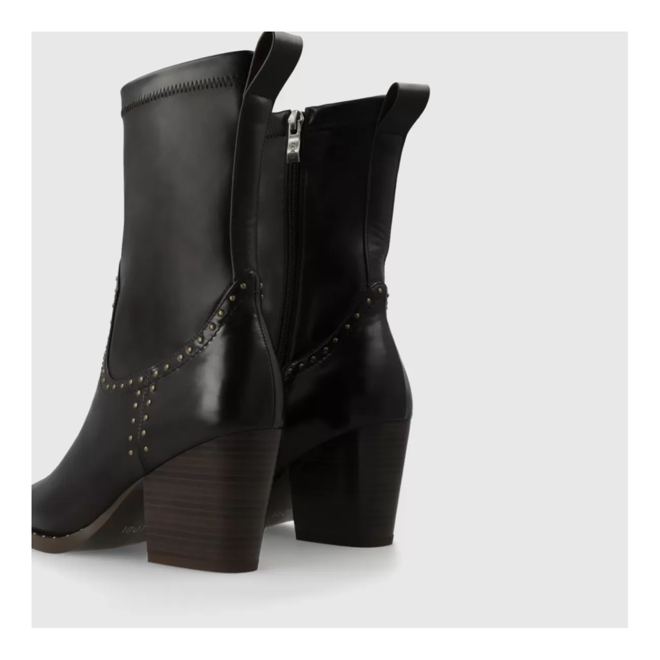 Bottines pour femme DE5086 de LODI en cuir et tige en tissu élastique. Design style cowboy avec détail de clous métalliques. Design avec talon de 8 cm de hauteur. Fermeture latérale intérieure par zip. Bout pointu. Intérieur doublé en tissu et semelle en cuir. Inclut une nouvelle semelle en gel pour plus de confort à chaque pas.