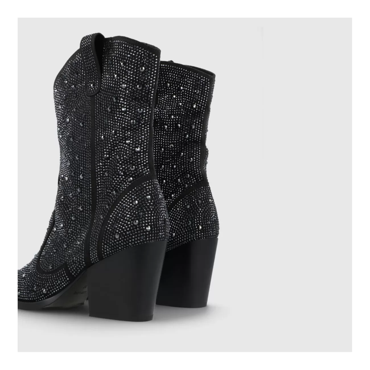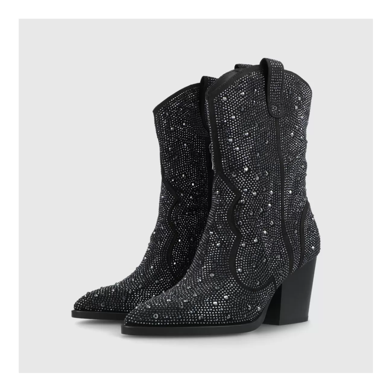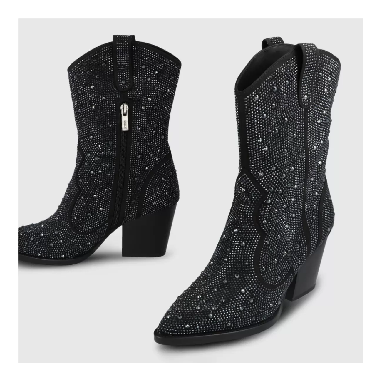 Bottines cow-boy femme en textile noir avec strass argentés.