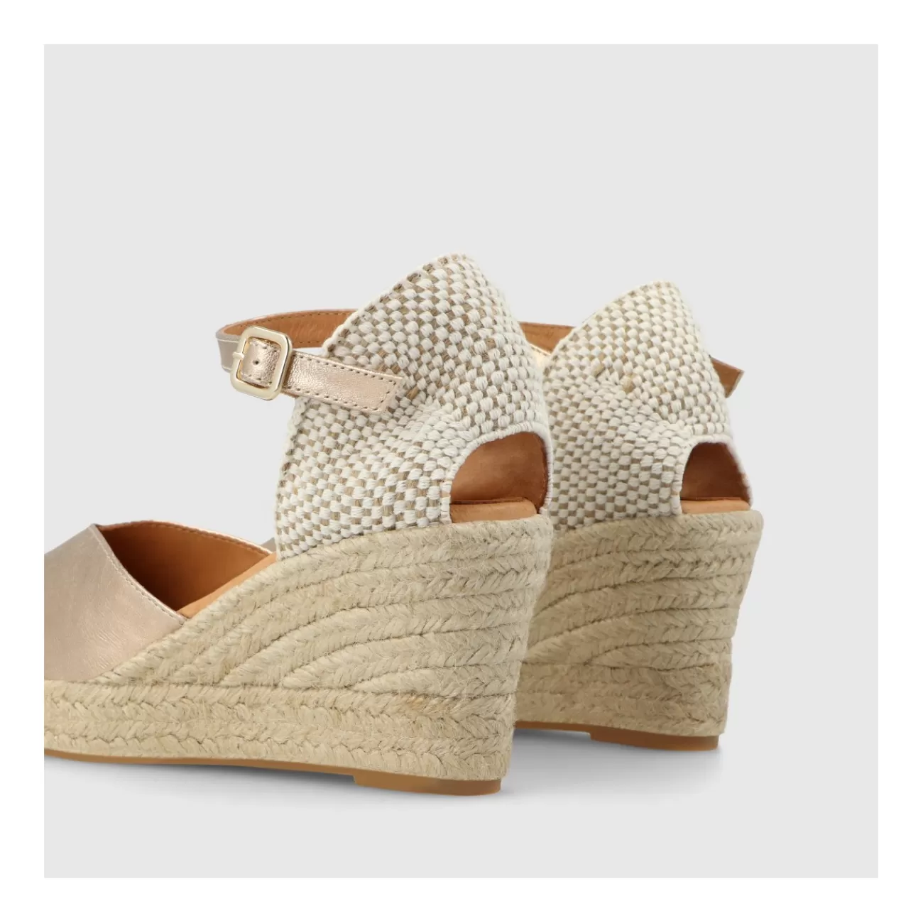 Espadrille femme POMELI de LODI en cuir métallisé doré. Fermeture latérale par boucle sur bride à la cheville. Talonnette en tissu tressé ton sur ton. Un basique incontournable de votre dressing. Décolleté en pointe. Doublure cuir. Modèle confectionné d´un talon compensé en jute naturel de 5 cm et d´une plateforme de 2.5 cm de haut. Fabriqué en Espagne.