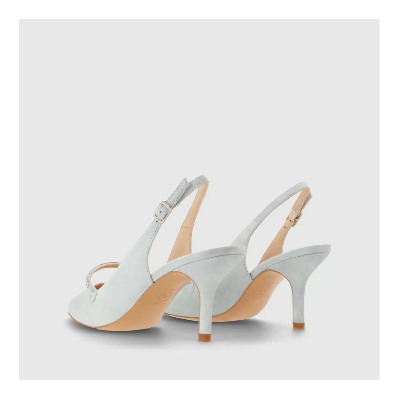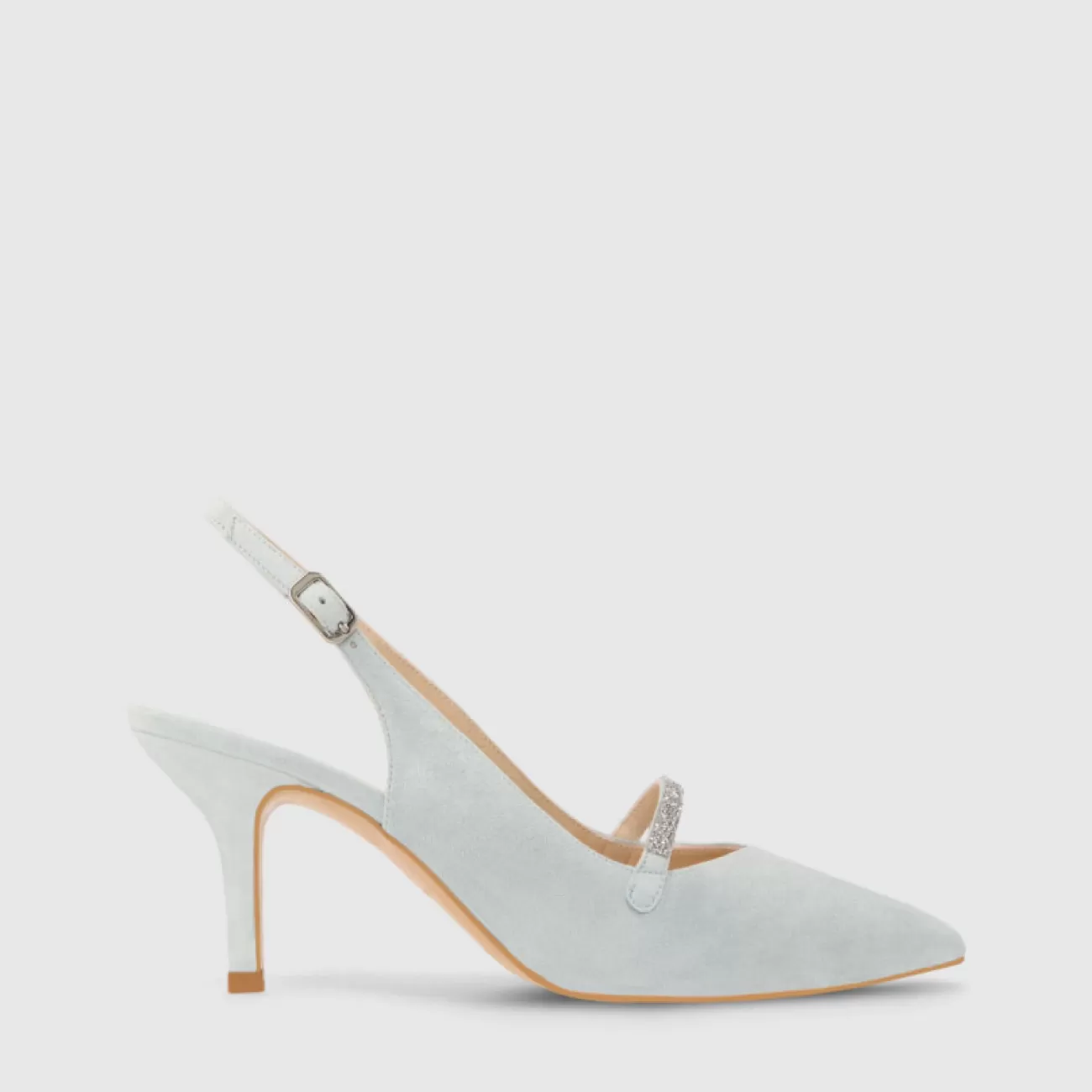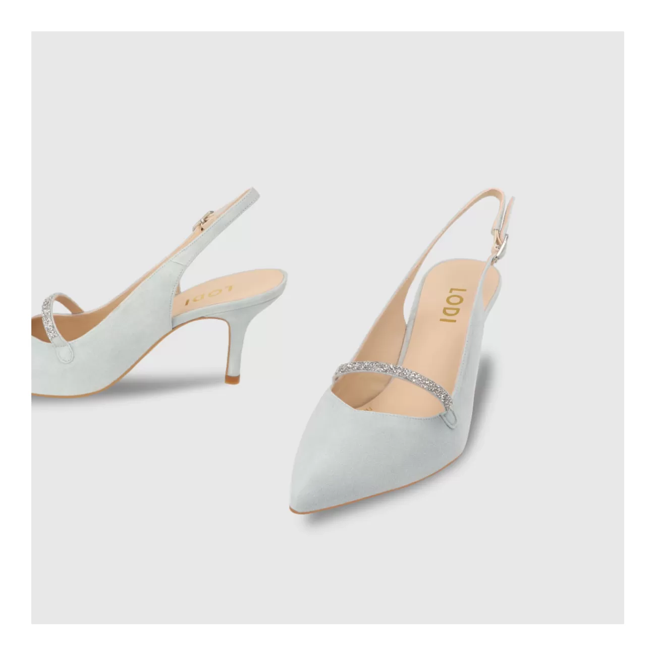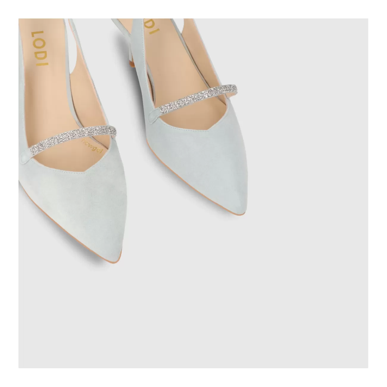 Salón destalonado MIRENE con tacón medio de 7.5 cm de altura de LODI NOVIAS. Confeccionado en ante de color azul cielo con diseño de tira de cristales. Tacón fino de 7.5 cm de altura y punta fina. Disfruta de uno de los días más especiales con el mayor confort con LODI NOVIAS. Interior forrado en piel. Incluye planta new gel para mayor comodidad en todas tus pisadas. Fabricado en España.
