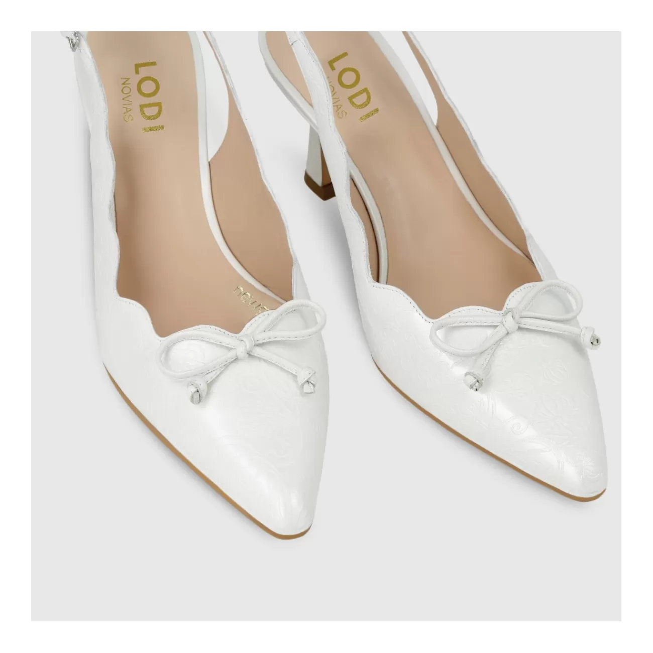 Zapatos de salón destalonados de novia GEMARI-NO de LODI en piel grabada de color blanco. Detalle de escote festoneado. Un diseño confeccionado con tacón de 7.5 cm de altura. Punta fina. Cierre lateral mediante hebilla metálica joya al tobillo. Interior forrado en piel. Incluye planta new gel para mayor comodidad en todas tus pisadas. Disfruta de la mayor comodidad en un día tan especial junto a LODI. Fabricado en España.
