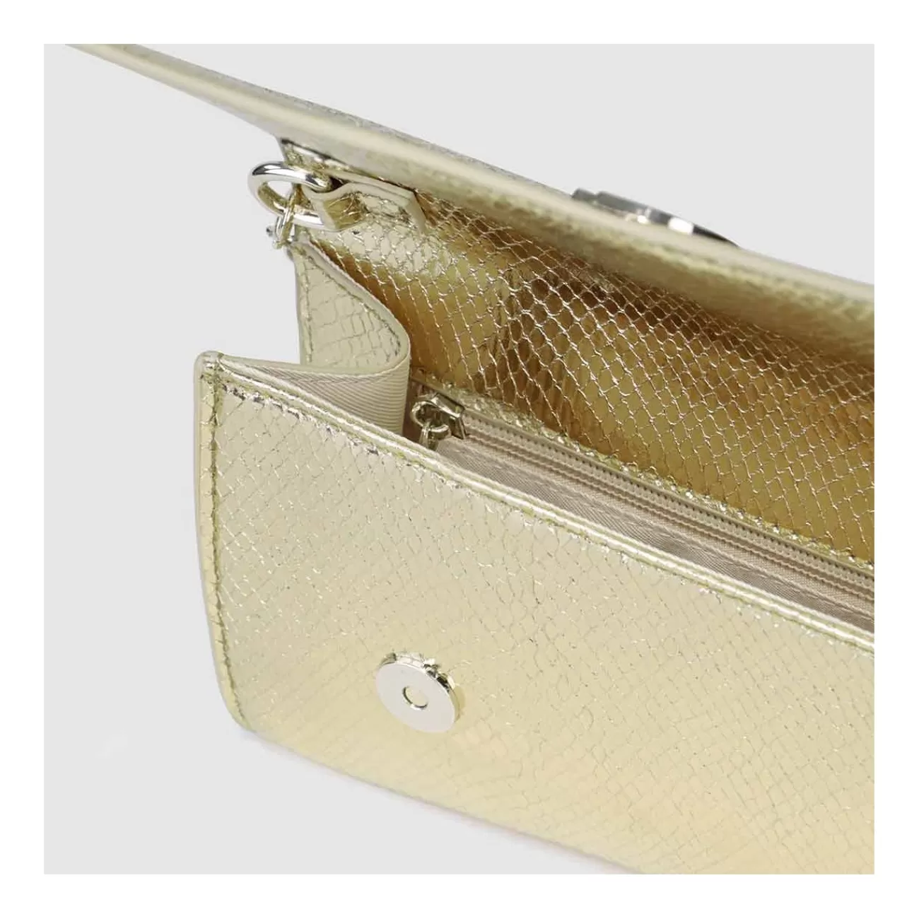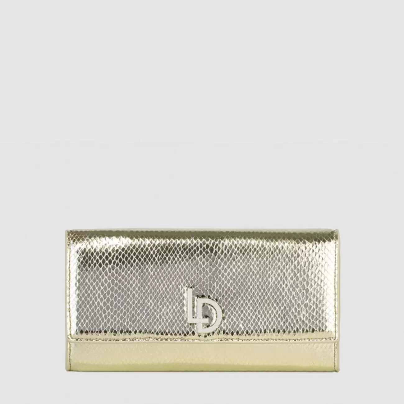 Sac type enveloppe modèle VOGUE de LODI, finition effet peau de serpent doré. Avec logo distinctif de la marque, une doublure en cuir et un fermoir magnétique. Chaîne intérieure incluse. Un accessoire minimaliste qui souligne votre élégance lors des occasions spéciales. Dimensions de 13 x 24.5 x 4 cm (H x L x P).